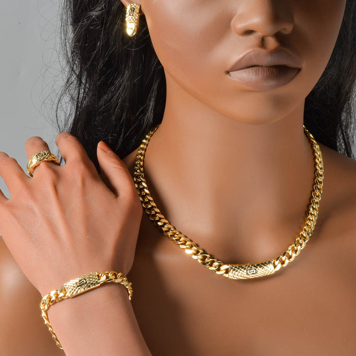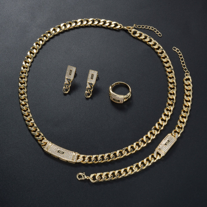 Elevate your style with this stunning jewelry set featuring a chic Cuban chain design and dazzling rhinestone accents, perfect for making a bold fashion statement.